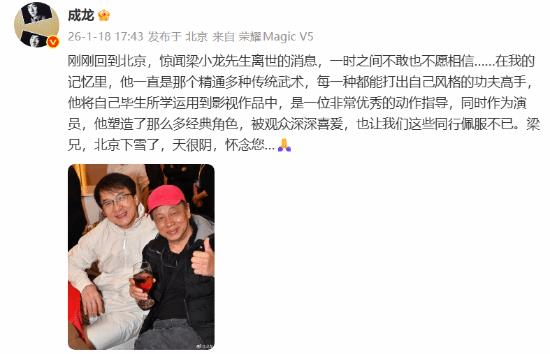 下午17:43,成龙在个人社交平台发文缅怀梁小龙。
