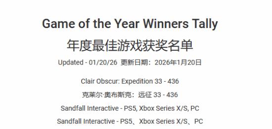 为《光与影:33号远征队》颁发年度游戏奖的媒体包括Geoff Keighley主持的TGA、Fami通、GameSpot、IGN、Game Rant、GamesRadar 以及Esquire等。此外,该作还获得了Insider Gaming、Destructoid、Game Informer等媒体读者评选的“读者选择年度游戏”奖项。(完整统计过长在此不便展出,感兴趣的玩家可点此查看>>>)