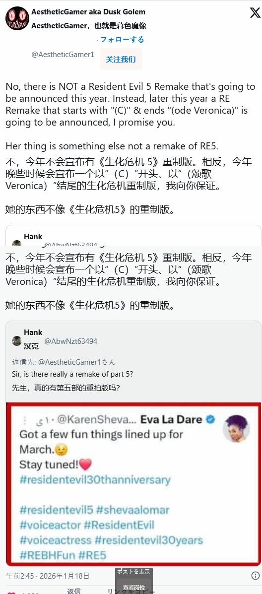 对此 Dusk Golem 明确回应,今年公布的重制作品不是《生化危机 5》,而是一款以字母 “C” 开头、以 “ode Veronica” 结尾的作品。