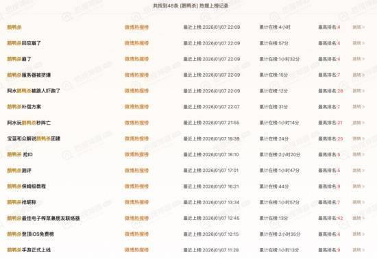 1月7日,《鹅鸭杀》这款由金山世游和虎牙联合推出的社交推理手游,正式在各大平台开放公测。仅仅一天,新增注册用户就超过了500万,还迅速攀上了iOS免费榜的榜首。在微博、快手、B站、抖音和小红书等社交平台上,《鹅鸭杀》引发了超过30个热搜话题,成为2026年开年最火爆的游戏之一。