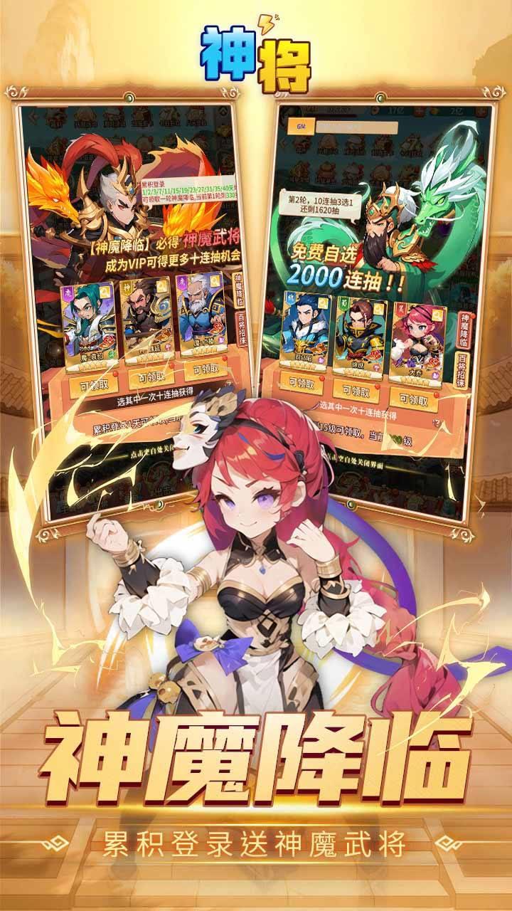 今天小编给大家推荐一下《神将》,这是一款把经典三国历史和奇幻元素融合在一起的0.1折卡牌冒险游戏,里面有创新的三国老虎机,还有全新的魂将开箱系统,玩法新颖福利也多,直接免费送自选2000连抽,累计登录就送神魔武将,连续八天都能领到海量资源,玩家可以亲自穿越到东汉末年,用独特的视角去感受那段波澜壮阔的历史,见证整个三国时代的风云变幻。