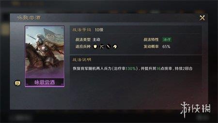 组合思路:洞若观火恢复单体兵力并施加清醒,咏歌尝酒在恢复兵力的同时提升统率,增强生存能力。