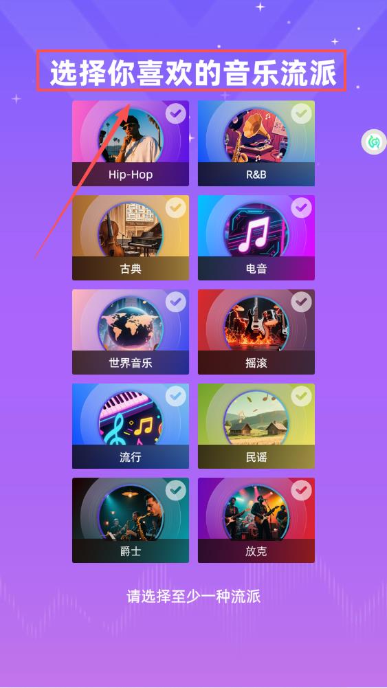 我是音乐家怎么玩1、启动软件先选择心仪流派,在紫色界面中点选圆形图标,hip-hop或流行都可,别忘了至少选一种才能继续哦。