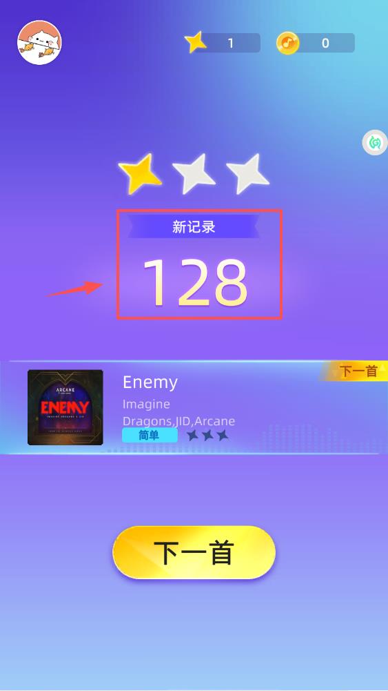 4、每局结束记得查看得分界面,破纪录会有蓝色标签,攒够星星还能解锁新曲目,用下一首按钮继续挑战吧。