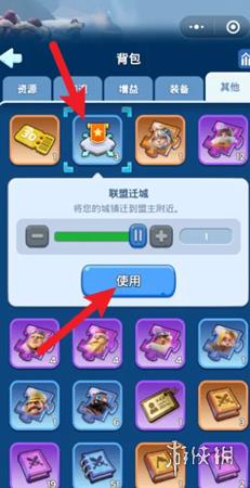 2、接着,进入背包页面后,找到联盟迁城道具并点击使用。