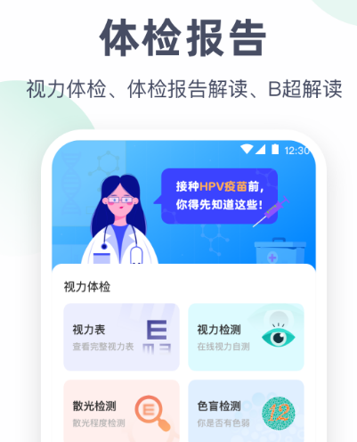 现在亚健康状态的人群越来越多,比如近视眼、高血压以及妇科疾病等各种慢性病会随时随地发生,利用这款软件可及时检测并评估健康风险。在伙伴们查询视力之后,可直接将个人的报告上传其中,化验单会直接解读,另外还会直接推出体检报告以及健康指标。在医院和医生沟通时有某些问题不了解,下载该软件可轻松解决。