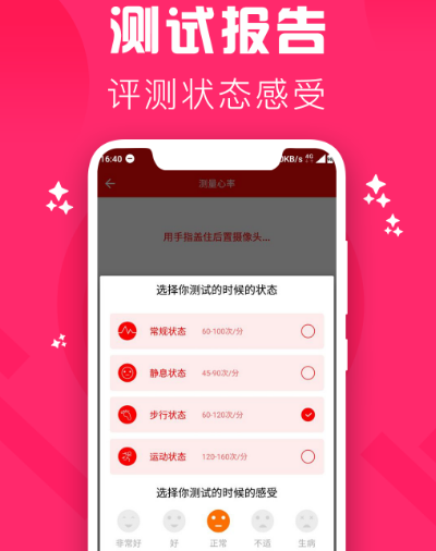 如今人们对体检特别注重,总希望通过体检的方式提前了解身体的各种问题,然后及时干预,这样不至于让较小的疾病研发成较大的疾病。这款软件可通过手机的方式来测试血压、视力、听力、情绪,另外还能测试心跳,当身体有某些问题时,手机即可检测出来并直接报警。根据用户每天的实际情况统计出健康数据报告,然后统计出趋势。