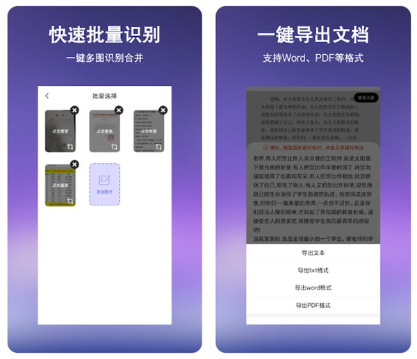 一款颇为专业的文字识别提取软件,说是手机上的扫描仪也不为过。通过调用手机的摄像头或者是导入图片之后就能够进行快速的批量识别,迅速将图片中的文字部分识别提取出来,字数比较少的可以选择复制出来,如果字数标多,可以直接导出为各种文档格式,从而方便进行下一步的编辑使用。