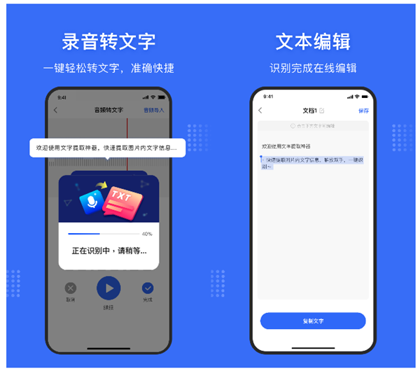 一款十分专业的文字提取工具,核心的功能就是通过拍照或者是导入图片来进行文字的识别和提取。除了图片转文字功能之外,利用软件中强大的工具还可以将录音中的文字识别听写下来,多种语言的识别和翻译让结果变得更加精准,也更加使用。