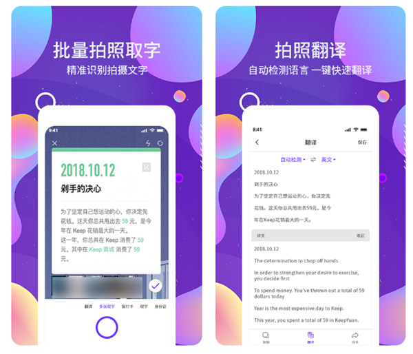 一款带有多种功能的图文识别软件,可以通过拍照将文档、证件、名片等录入为电子版文档或者是复制使用其中的文字内容。软件还集成了拍照翻译的功能,可以将识别出来的外国文字直接转化为中文,也能够将语音文件中的文字识别出来,还是比较方便的。