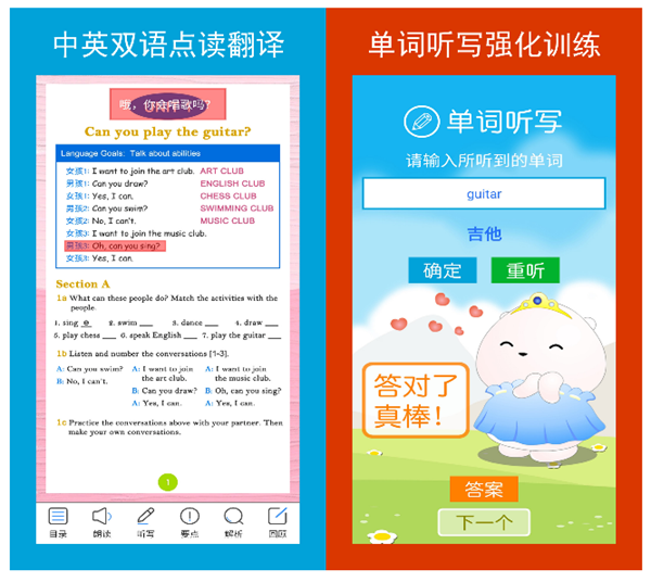 同样是一款强大的英语课本点读软件,这款工具主要面向的还是人教版的课本,而且教材十分齐全,囊括了小学到高中阶段,供我们免费下载和跟读。软件的操作也是比较简单的,进入点读模式之后只需要点击文中对应的位置就可以自动播放相关录音,真人的发声更加准确。还带有丰富的听写、跟读测试,全方位提升英语的水平。