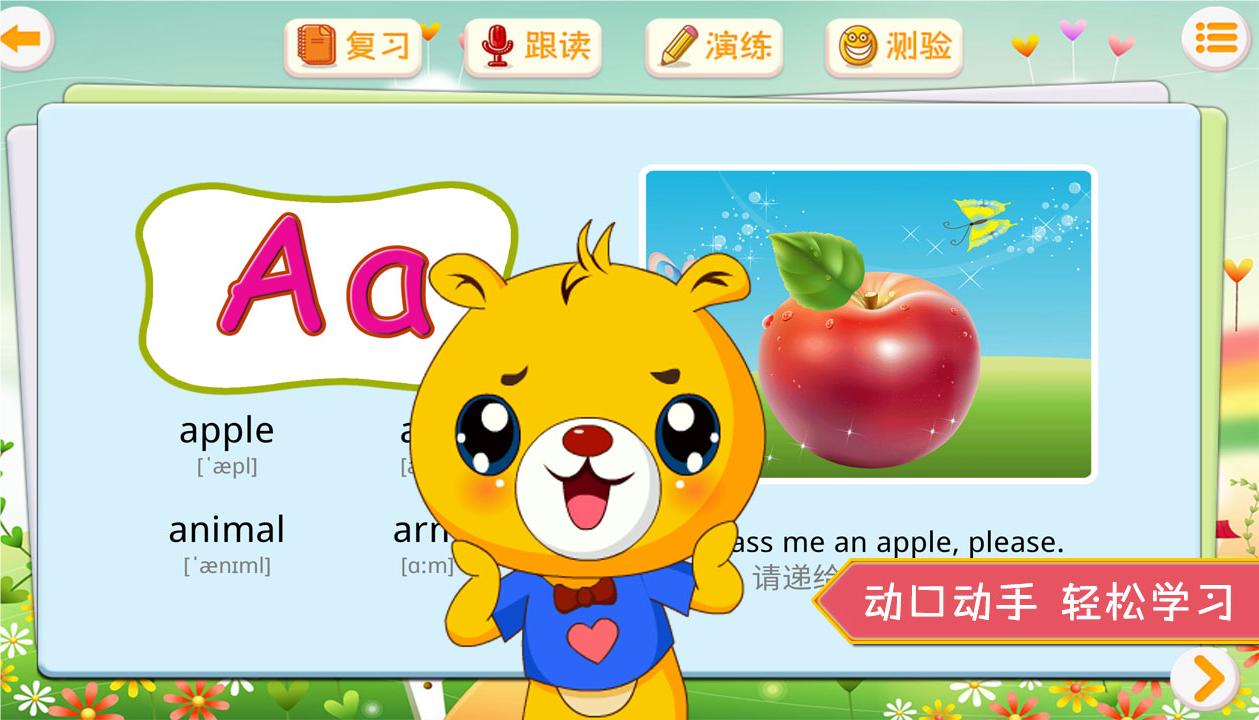 软件以轻松启蒙为主,从音标、字母开始,进一步认识简单的单词,加强发音练习,通过发音、阅读、手写等方面互动学习,反复记忆与演练,参与趣味测试等。
