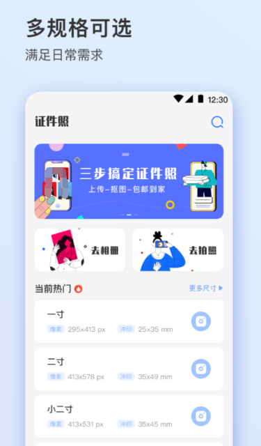 这是一款可以给大家提供免费制作证件照的软件。有了他,需要制作证件照的时候,在这款软件上就能完成。这里,提供了简单、快捷的证件照处理,而且这里的各种证件照制作以及是免费的,将制作好的证件照直接下载到手机本地,同时也可以导成png或者jpg格式,更加容易打印。