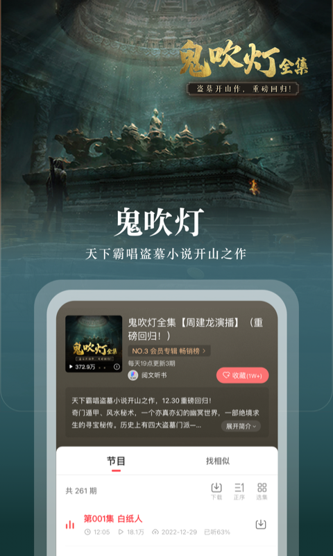 这个听书软件也是一个知名度比较广的了,很多知名的小说都可以在里面听,比如《鬼吹灯》系列或者是《盗墓笔记》系列等等。除此之外一些相声作品也是有的,比如春晚的一些小说作品,还有郭德纲的作品等等。