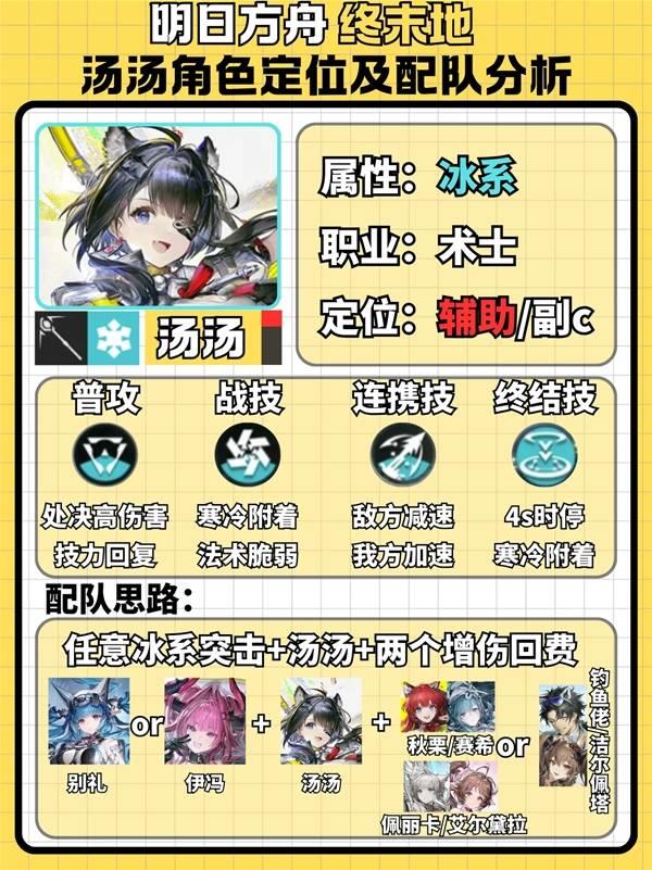 汤汤可以说是冰队的一块强力评图,高速的寒冷附着缩短了主c爆发的启动时间,同时还有法术脆弱,减速,加速,技力回复等辅助效果的同时也有一定的输出能力。如果是主玩冰队想补强冰队的管理员,汤汤无疑是必抽的存在!